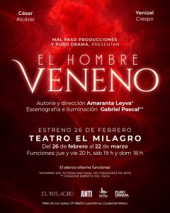 | Breve sinopsis: | El Hombre Veneno es una farsa para adultos donde un monólogo encarna en dos cuerpos —ella y él— que alternan la caída en una pasión adictiva. Humor ácido, confesión sin pudor y un sillón de piel donde ocurre TODO. Una experiencia escénica sobre el placer, el poder… y sus consecuencias. |