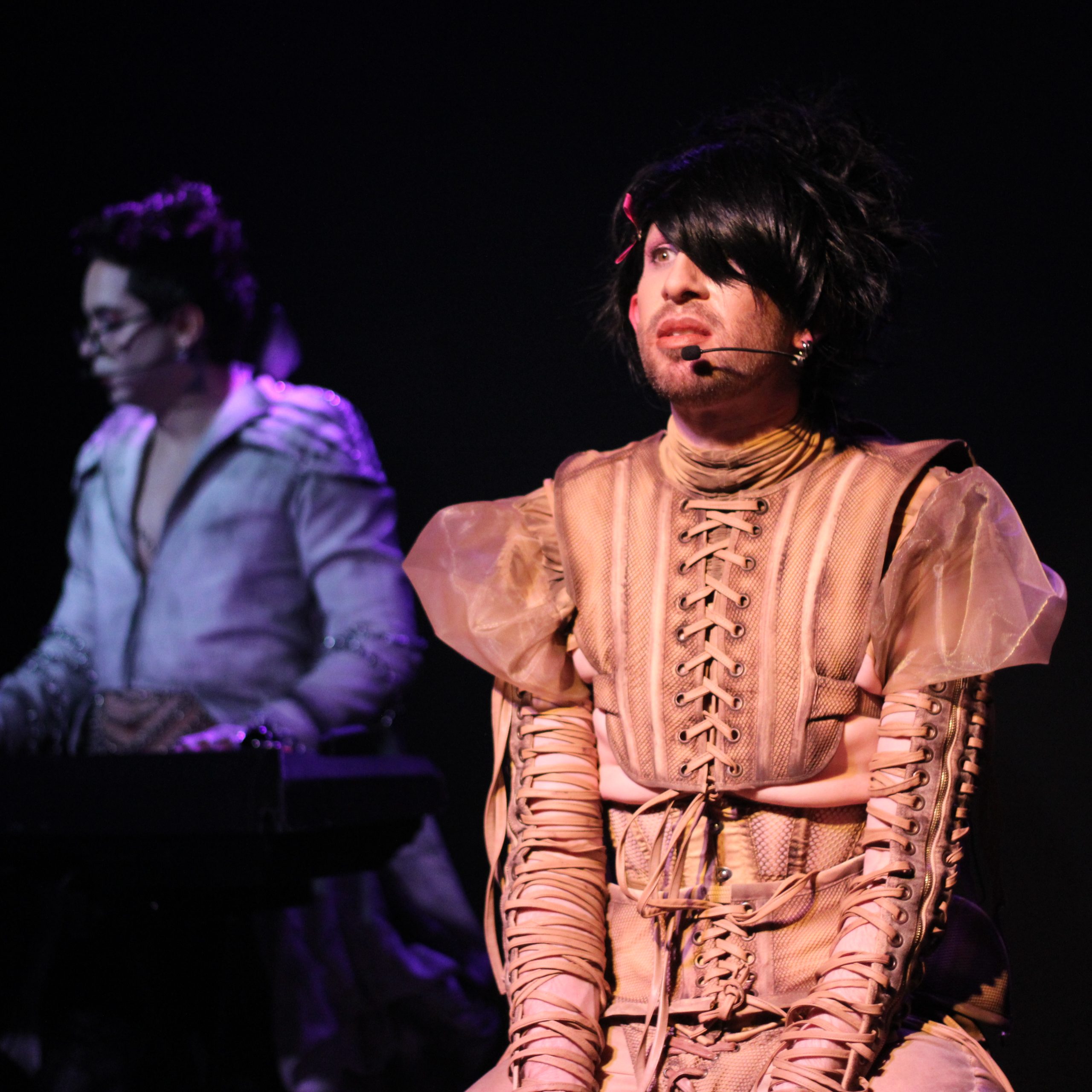 Doctor Fausto, un excéntrico científico, y Mortis, su asistente, crean a Espectro: un ser ensamblado con fragmentos de cadáveres que conservan las memorias de sus vidas pasadas. Pero su aldea, incapaz de comprender lo que no encaja en la norma, los expulsa violentamente. Espectro, junto a sus creadores, emprende un viaje para recuperar su identidad. Sin embargo, están de vuelta… y con un último recuerdo por rescatar. A través de flashbacks, interacción directa con el público y momentos de humor satírico, la obra expone la lucha por existir cuando el mundo insiste en que no deberías. La narrativa rompe la cuarta pared para que el público se convierta en cómplice y, finalmente, en quien decide el destino de Espectro: ¿se puede reescribir un final injusto? Espectro combina el lenguaje del musical con referencias nostálgicas a anime como Sailor Moon, Digimon y Dragon Ball, con arreglos de rock emo y toques pop inesperados. La música –a cargo de David Federico Suzawa– no sólo acompaña, sino que se convierte en un personaje vivo que dialoga con les protagonistas. El vestuario, diseñado por Erick George, es un elemento narrativo clave: pelucas, máscaras 2D y accesorios que permiten a Sergio Carazo Cardona interpretar múltiples personajes con fluidez y potencia expresiva. Todo en escena, desde lo actoral hasta lo visual, está al servicio de un discurso que reivindica lo queer, lo distinto, lo excluido.
