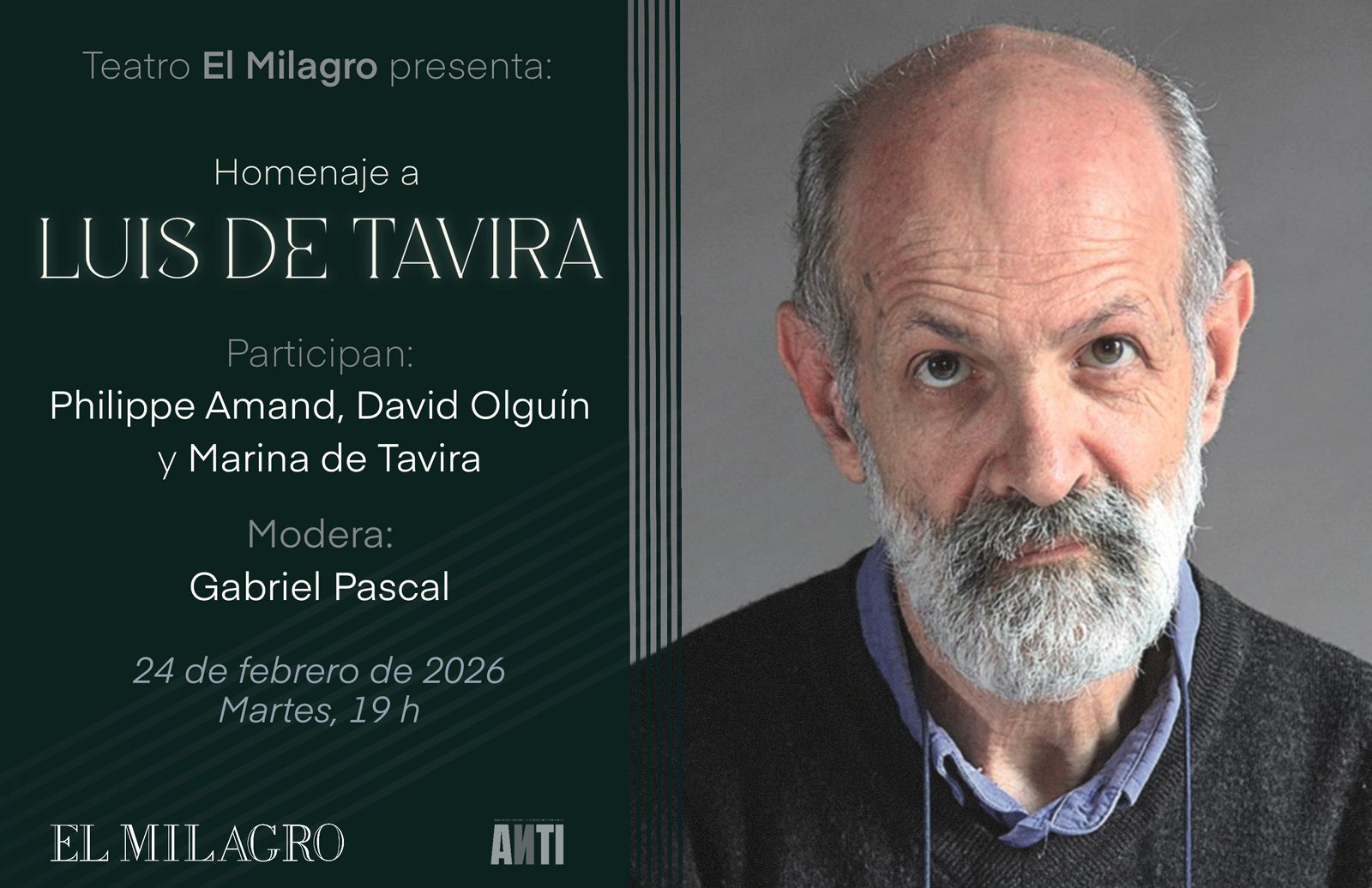 Teatro El Milagro rendirá homenaje al maestro Luis de Tavira el próximo 24 de febrero a las 19:00 horas, en una ceremonia especial que forma parte de la tradición del teatro de reconocer, año con año, a una personalidad ilustre cuya trayectoria haya marcado de manera profunda la escena teatral mexicana.