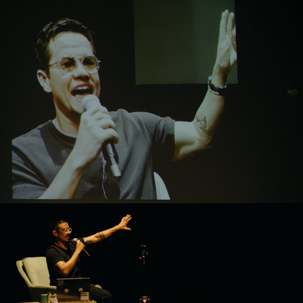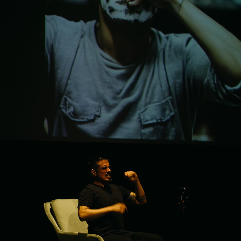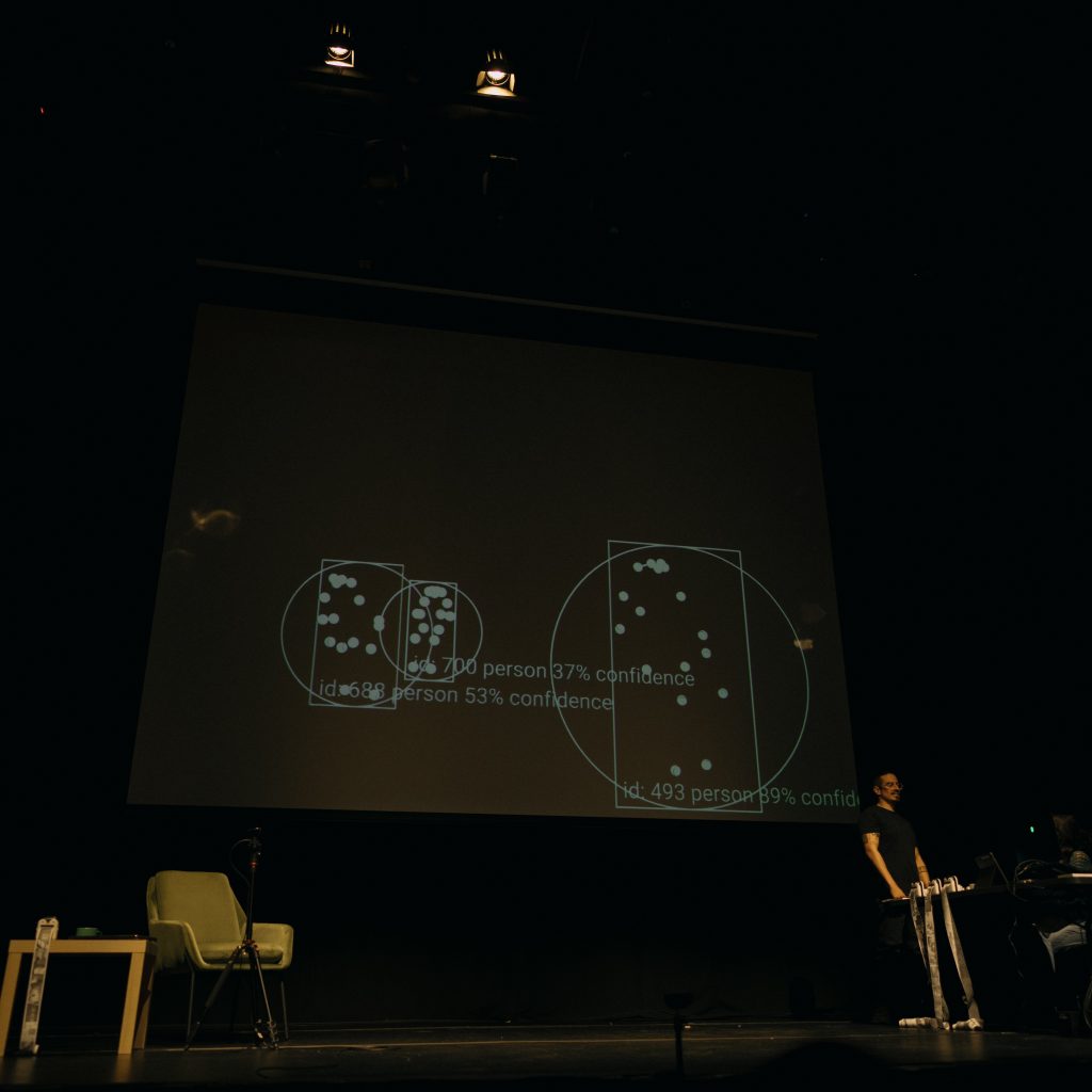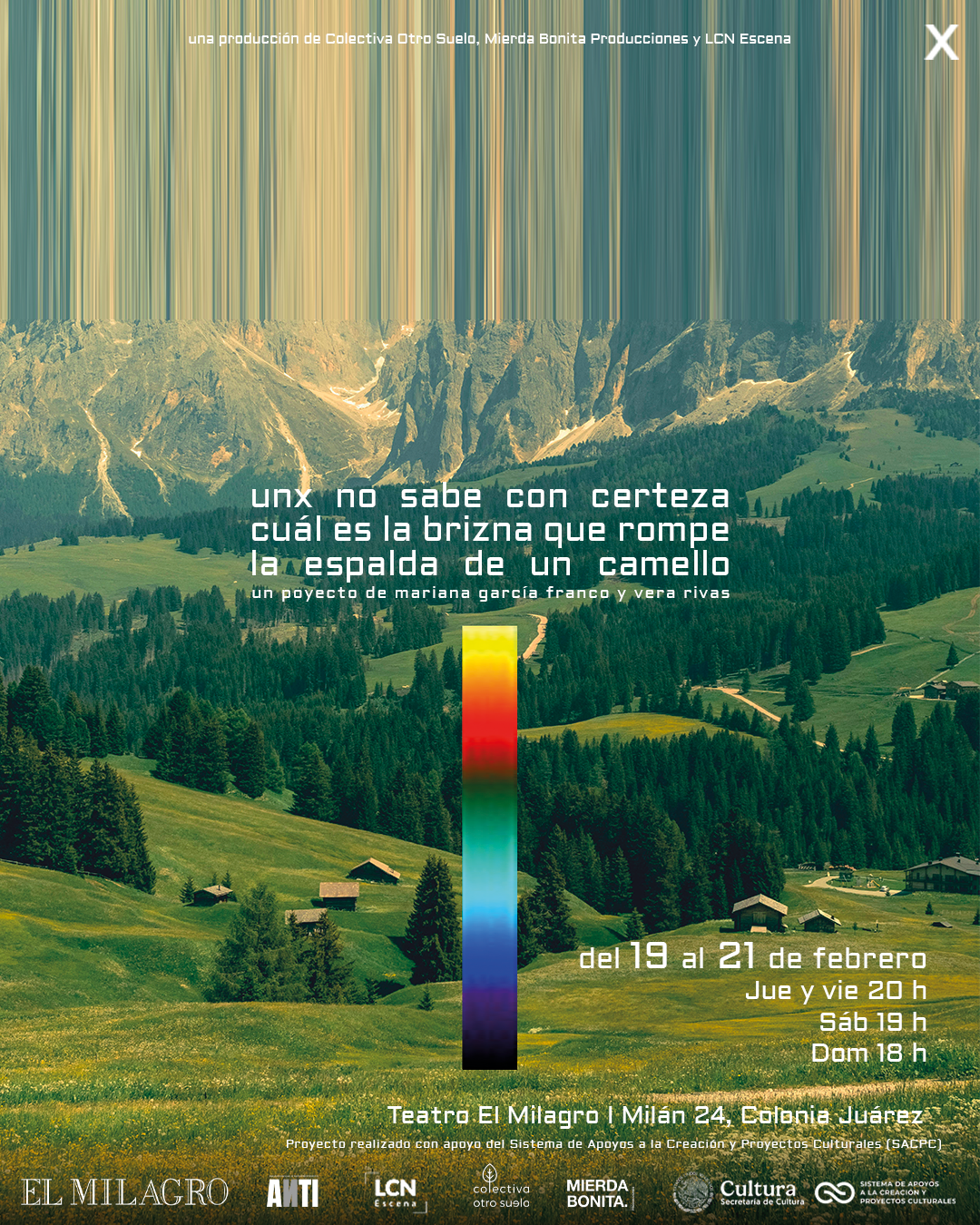 Unx no sabe con certeza cuál es la brizna que rompe la espalda de un camello es un ensayo escénico interdisciplinar en forma de conferencia performática creado por Mariana García Franco y Vera Rivas junto con un equipo de creadores con lenguajes diversos. La pieza indaga cómo las narrativas hegemónicas se instalan en nuestras maneras de habitar el mundo y moldean el deseo, y la memoria. En escena, una mesa con dispositivos, una pantalla, inteligencia artificial y un cuerpo exponen imágenes que manipulan, comparan o abren otros caminos.